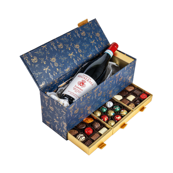 Cutie premium cu sertar pentru ciocolată și vin, conține selecție 27 praline asortate Leonidas și o sticlă de vin rosu/Prosecco în compartiment dedicat. Ediție limitată.