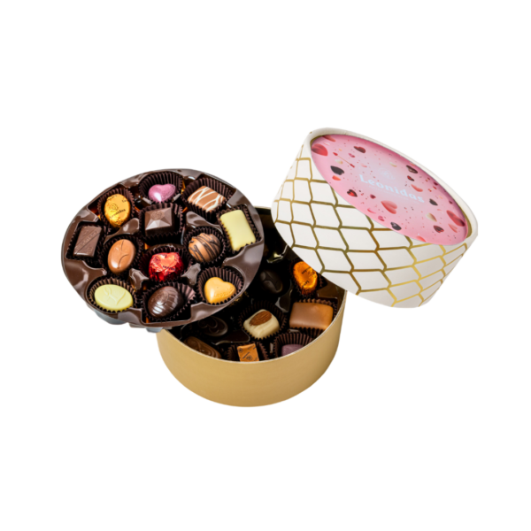 Cutie elegantă rotundă, culori romantice, conține asortiment praline dispuse pe două straturi. Cutie cadou ediție limitată.