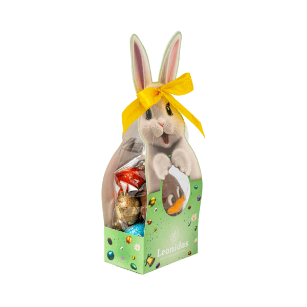 Cutie tematică de Paște, în formă de iepuraș, umplută cu mini-ouă sau praline de ciocolata. Poza este cu titlu de prezentare iar pralinele pot diferi. Vezi ingredientele și alergenii produselor de Paște  aici!