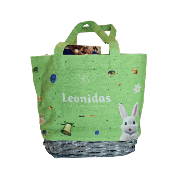 Gentuță Paște Leonidas cu partea superioară textilă și bază împletită din lemn. Gentuța este un cadou elegant de sărbători și conține: