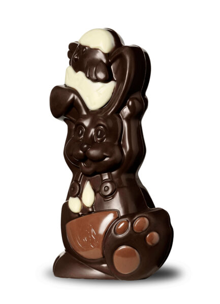 Figurină de Paste colorată, în formă de iepure cu salopetă și pensule de desen și un pui de găină pe cap, din ciocolată neagră. Iepurașul de Paște este perfect pentru masa în familie sau pentru a fi oferit cadou. Poză cu titlu de prezentare.Vezi ingredientele și alergenii produselor de Paște  aici!